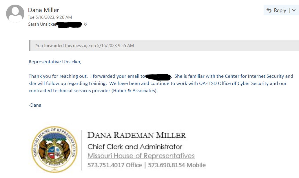 I don’t know about the Fireside contract, but based on my experience with computer security in Missouri, I’m tempted to think that a commercial product would be more secure than whatever we’re currently using. The judge’s signature issue and publishing employee Social Security numbers should be enough, even without retaliation for noticing. But I’ve also had my own personal concerns about security within the Missouri House. And Dana has been specifically unhelpful.